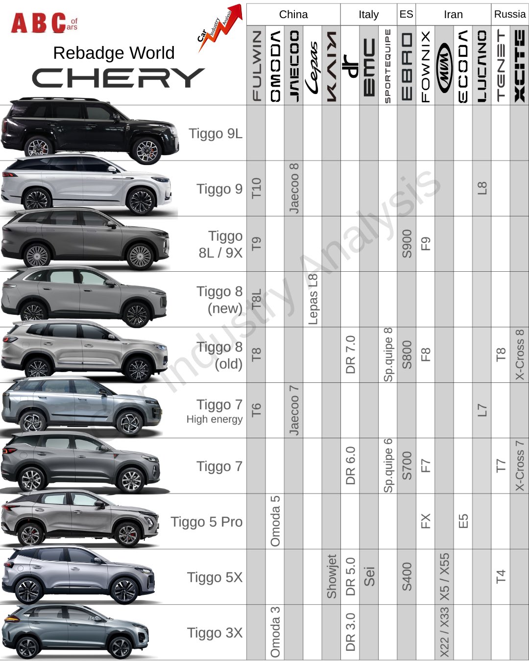 Третий по величине китайский автопроизводитель CHERY — мастер ребрендинга. В настоящее время он предлагает 12 различных брендов по всему миру, а также выпускает автомобили под собственными брендами.