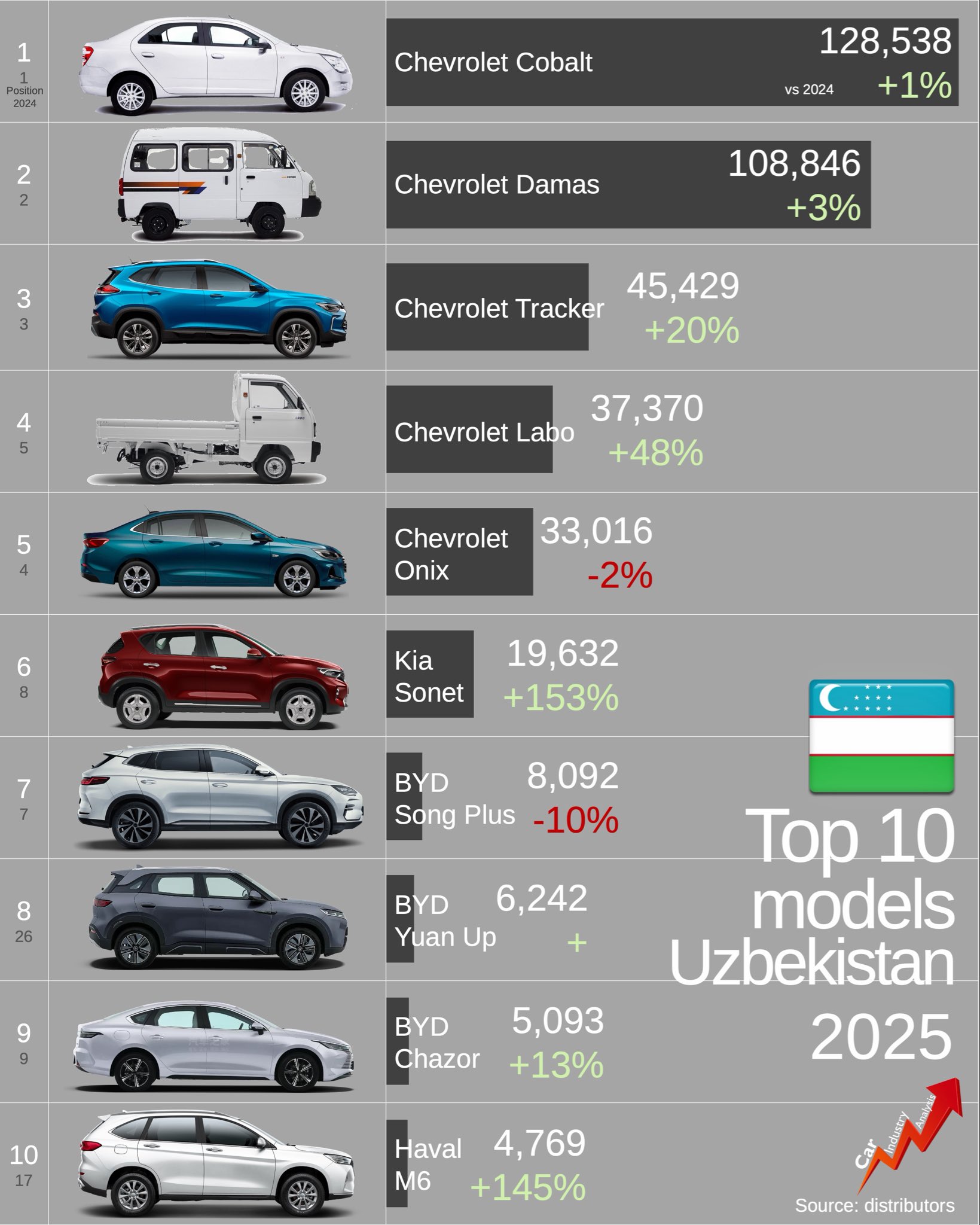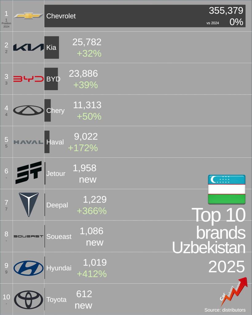 Автомобильный рынок Узбекистана в 2025 году вырос на 8 % по сравнению с 2024 годом — продано 433 237 новых автомобилей. Это несмотря на ограничения и монополию государства. Chevrolet (контролируемый UzAuto Motors, принадлежащей правительству) захватил 82 % рынка — абсолютная доминация. Рынок медленно открывается миру, но западные бренды (Toyota, Mercedes) — новички с маленькими объёмами. Китайцы показывают взрывной рост: Changan +348 %, GWM +174 %, Chery +85 %, BYD +39 %. В этой статье разберём топ-10 групп, брендов и моделей по данным Distributors (декабрь 2025).