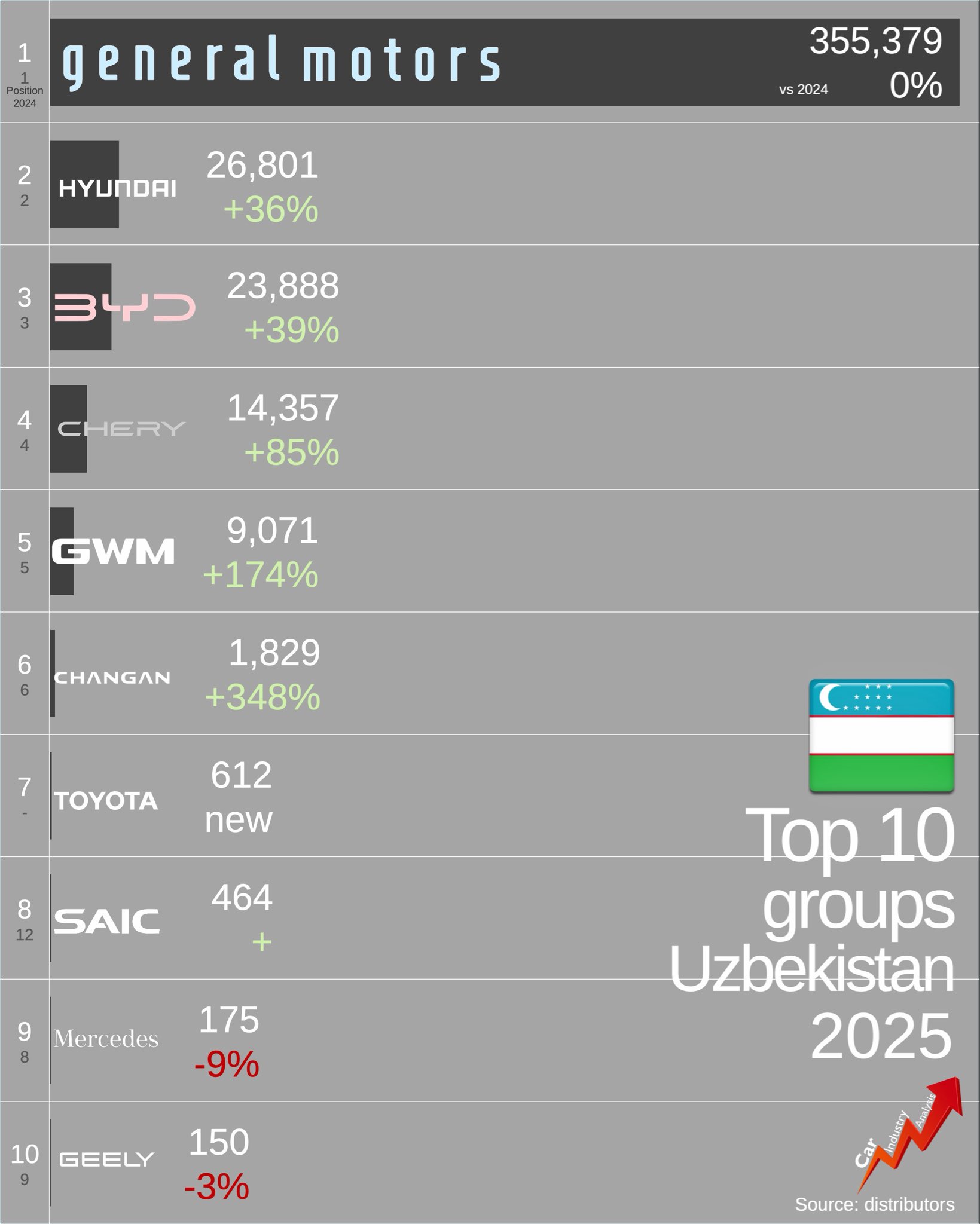 Узбекистан 2025 — рынок с монополией Chevrolet 82 %, но с ростом +8 % и открытием для Китая. Китайцы уже в топ-5 групп и моделей, с ростом +100–400 %. Toyota и Hyundai — новички, но с потенциалом. Рынок медленно открывается, но UzAuto держит контроль. В 2026 ждём ещё больше китайских и корейских новинок.