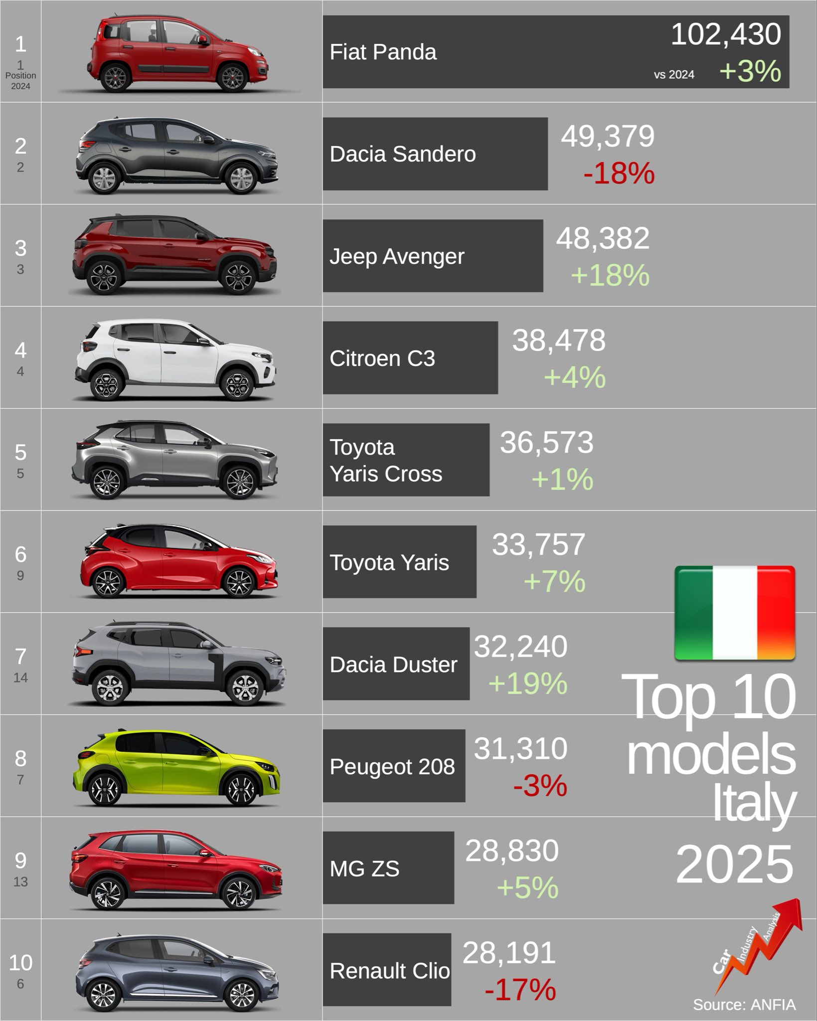 Данные: ANFIA. Fiat Panda остаётся абсолютным лидером — почти 7 % рынка. Jeep Avenger и Dacia Duster показывают сильный рост, а китайский MG ZS впервые входит в топ-10.