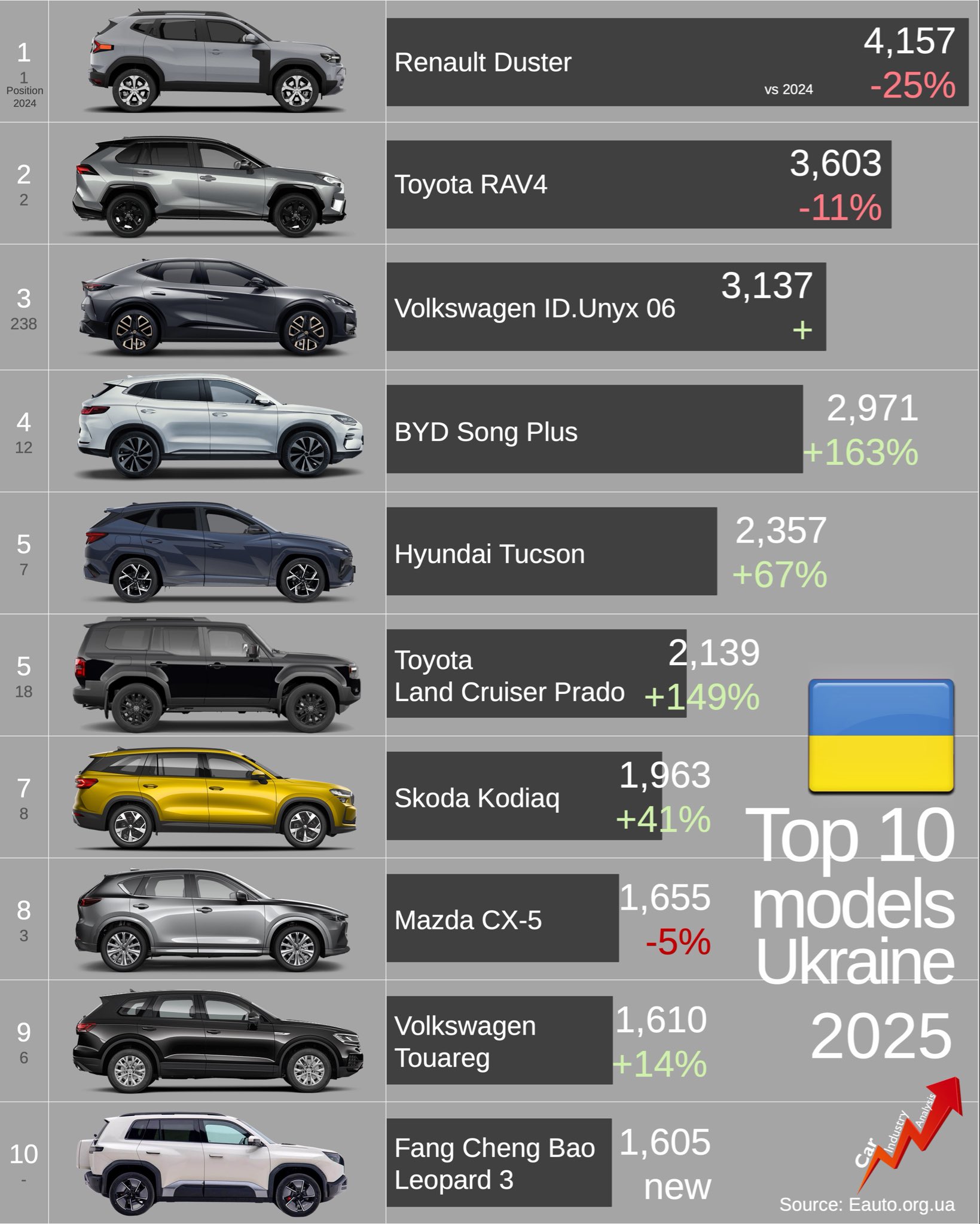 2025 год стал переломным для украинского рынка: традиционные лидеры (Duster, RAV4) ещё держатся, но китайские электрокроссоверы и гибриды уже захватывают вторую половину года. В 2026 году ожидается ещё более жёсткая конкуренция — BYD, Zeekr и другие китайские бренды могут выйти на первые места.
